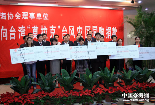 中国台湾网8月12日北京消息 海协会18家理事单位今天下午联合举行捐款仪式,向台湾“莫拉克”台风受灾地区捐款1亿1100万元人民币。