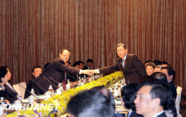 4月18日,海协会与海基会在台北就两会领导人第三次会谈的相关事宜进行预备性磋商。这是海协会常务副会长郑立中(左)与海基会副董事长高孔廉(右)在磋商开始前握手。新华社记者张勇摄