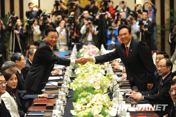 4月26日上午,海峡两岸关系协会会长陈云林与海峡交流基金会董事长江丙坤在南京举行会谈。这是两会恢复协商后领导人第三次会谈。新华社记者 韩瑜庆摄