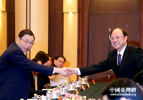 今天上午,两岸商签经济合作框架协议(ECFA)第一次两会专家工作商谈在北京钓鱼台大酒店举行,图为海协会副会长郑立中(右)与海基会副董事长兼秘书长高孔廉。(中国台湾网 张弛 摄)