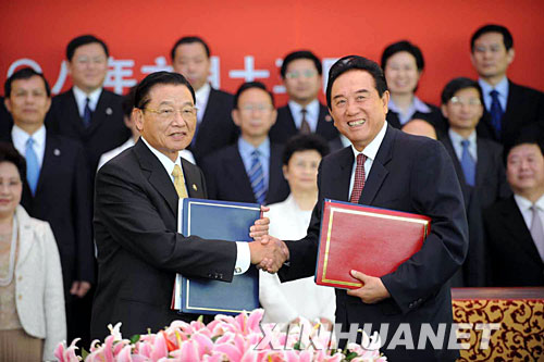 6月13日9时许,海协会与海基会在北京就两岸周末包机与大陆居民赴台旅游签署协议。这是海协会会长陈云林和海基会董事长江丙坤在签字仪式上握手。 新华社记者李晓果摄
