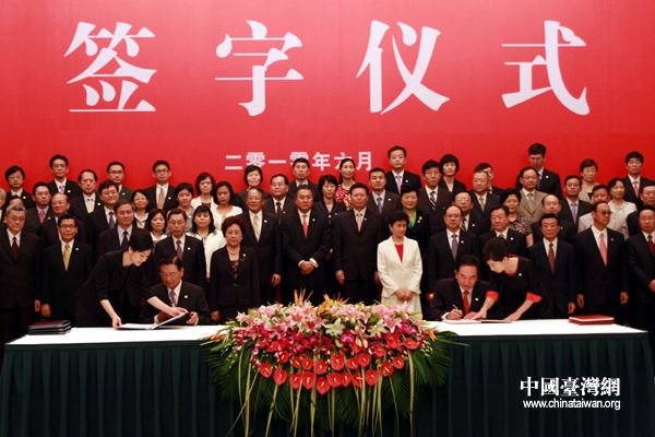 中国台湾网6月29日重庆消息 今天下午2时30分许,海协会与台湾海基会在重庆申基索菲特大酒店,举行两岸经济合作框架协议(ECFA)以及两岸知识产权保护合作协议签字仪式。(记者 张弛 钟宝华)
