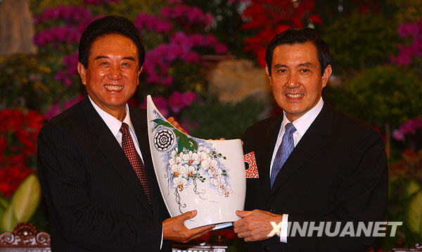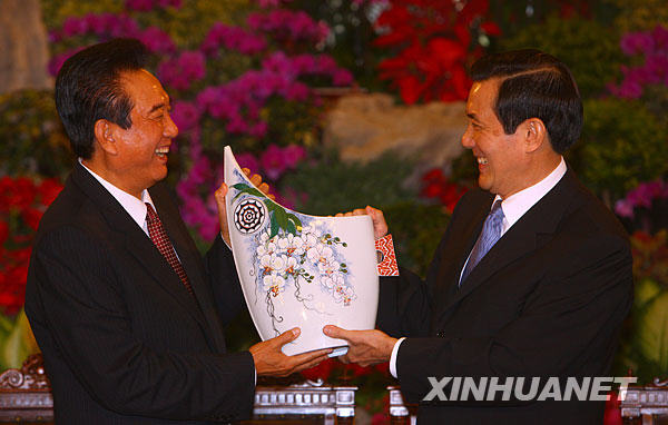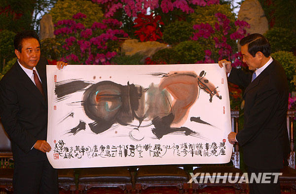11月6日,马英九在台北宾馆会见海协会会长陈云林一行。这是陈云林向马英九赠送礼品。新华社记者 邢广利 摄