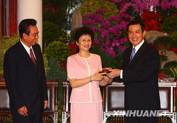 11月6日,马英九在台北宾馆会见海协会会长陈云林一行。这是马英九向陈云林夫人赖晓华赠送礼品。新华社记者 邢广利 摄