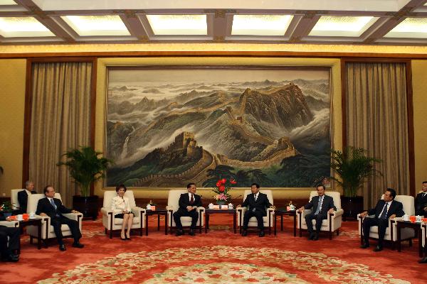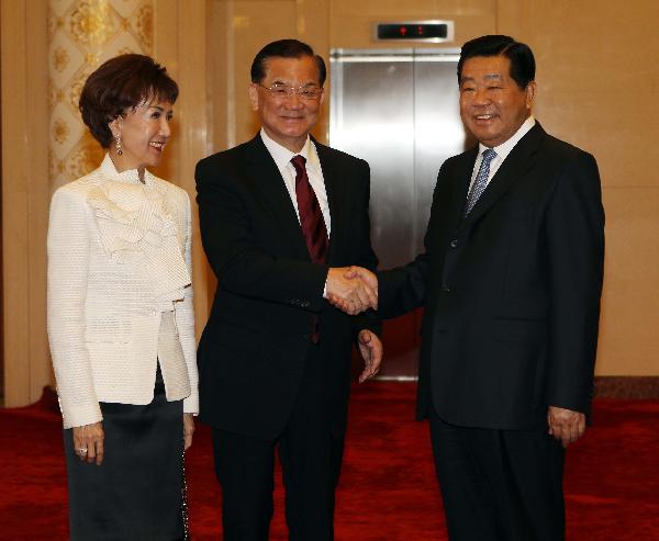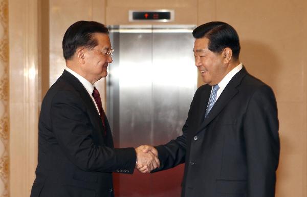 5月7日,中共中央政治局常委、全国政协主席贾庆林在北京人民大会堂会见中国国民党荣誉主席连战和夫人及随行人员。 新华社记者刘卫兵摄