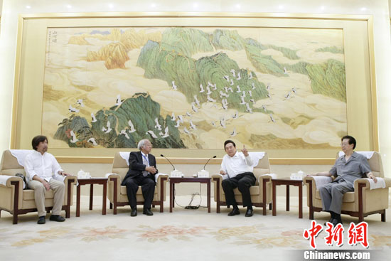 海协会会长、全国政协港澳台侨委员会主任陈云林出席海峡两岸书画作品展开幕式并会见参展的两岸艺术家。中新社发 盛佳鹏 摄