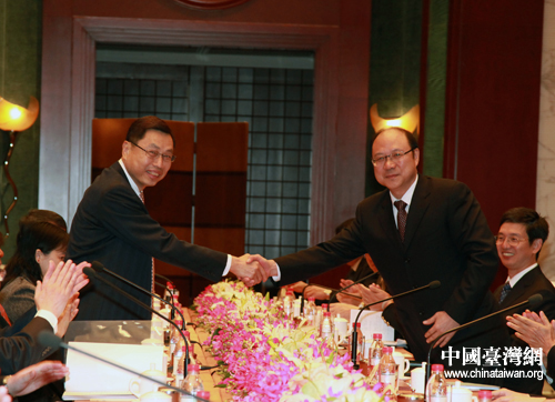 11月1日,两岸经济合作委员会第二次例会在浙江省杭州市举行。经合会大陆方面召集人、海协会常务副会长郑立中(右)与台湾方面召集人、海基会副董事长高孔廉(左)握手。 (中国台湾网特约记者 王健 摄)