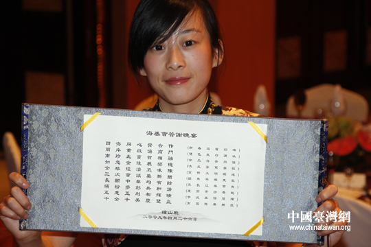 海基会答谢晚宴菜单别具匠心,菜名分别为“四海同心齐合作、两岸重启协商门、南珍北宝贺相容、如意金陵展契机、全球经济五味陈、三次会谈奠新犹、长愿中华均有余、缤纷多彩共和谐、互惠互利相辉映、十全十美庆双赢”(中国台湾网 钟宝华 摄)