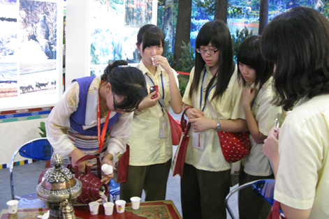 罗东高中的同学们兴奋地品尝西藏酥油茶。