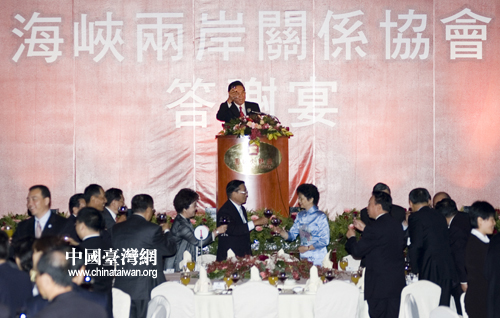 陈云林致辞时指出,两岸两会成功签署了《海峡两岸空运协议》《海峡两岸海运协议》《海峡两岸邮政协议》和《海峡两岸食品安全协议》等四项协议,为两岸关系和平发展交出了亮丽的答卷。他并对这些天努力在内外维安的台湾警务人员,对为海协会协商代表团无微不至地服务的台北圆山饭店工作人员,对积极报道两会协商、签署协议的媒体记者表示衷心感谢。