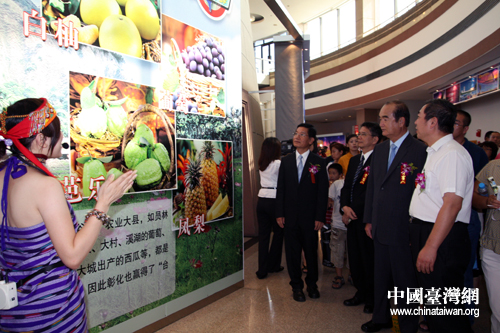 花莲县县长谢深山(中),海峡两岸经济科技合作中心策划部部长袁塞冰(左一)等参观“畅游台湾主题馆”(中国台湾网 李徽 摄)