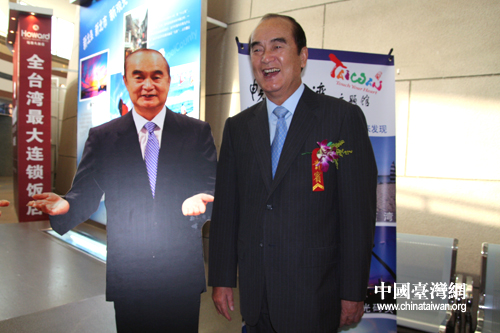 花莲县县长谢深山在主题馆内自己的“形象牌”前热情为花莲县做推介(中国台湾网 李徽 摄)