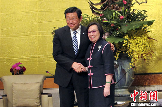 12月2日下午,海协会会长陈德铭在台北拜会已故台湾海基会首任董事长辜振甫先生的夫人辜严倬云女士。图为陈德铭与辜严倬云女士握手合影。中新社发 叶小刚 摄