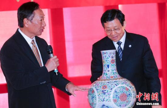 郭台铭代表鸿海,向陈德铭致赠一个斗彩唐草团花天球瓶,寓意两岸和平、经合顺利。另赠送专门为母亲订作的凤梨酥,郭台铭笑言“绝对保证食品安全”,引来一阵掌声。