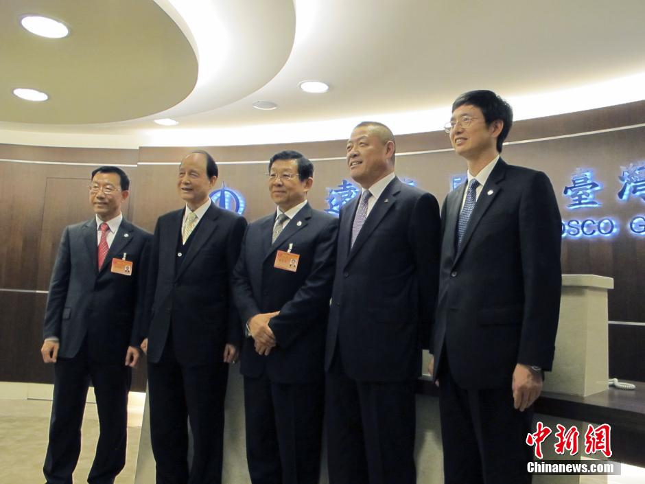 12月1日下午,海协会会长陈德铭参访中远集团驻台湾代表处,这也是海协会经贸交流团此行到访的首家大陆央企在台湾的分支机构。图为陈德铭(右三)、海基会董事长林中森(左二)与该办事处负责人合影。中新社发 叶小刚 摄