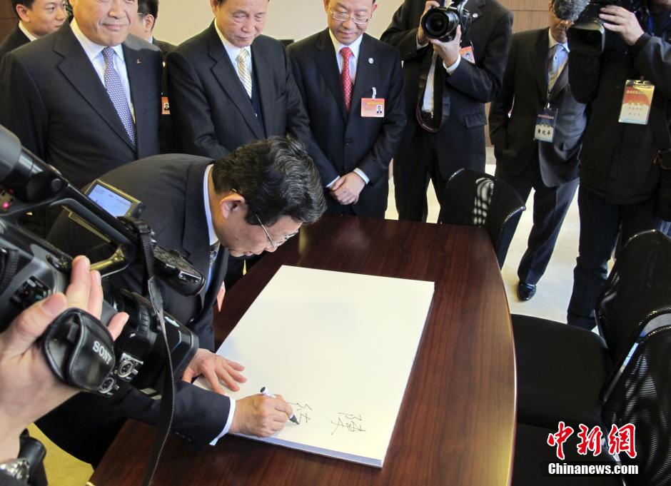 12月1日下午,海协会会长陈德铭参访中远集团驻台湾代表处,这也是海协会经贸交流团此行到访的首家大陆央企在台湾的分支机构。台湾海基会董事长林中森陪同参访。图为陈德铭在贵宾册上签名。中新社发 叶小刚 摄