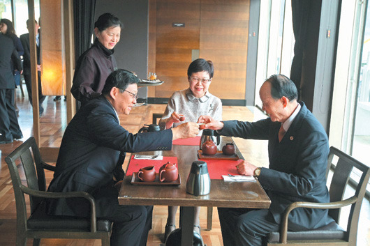 陈德铭昨首度造访台北故宫博物院,院长冯明珠在导览完后,与林中森一同在三希堂茶叙;陈德铭接过冯院长的茶水后,立即端起小茶杯“以茶代酒”相敬。