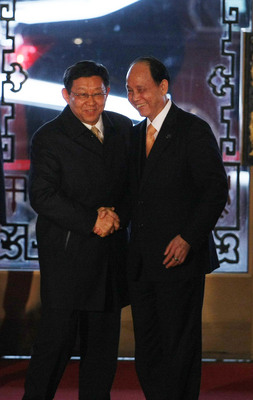 海峡两岸关系协会会长陈德铭(左)26日抵达台北圆山大饭店,台湾海峡交流基金会董事长林中森(右)热情迎接。(图自台湾“中央社”)