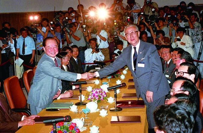 1993年4月27日,首次“汪辜会谈”在新加坡开始,海协会和海基会代表各10人参加了会谈,这是海峡两岸授权民间机构领导人的第一次晤谈。会谈前汪道涵(左)与辜振甫握手。 新华社发