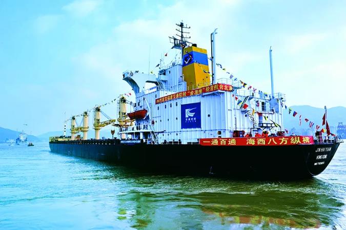 2008年12月15日,海峡两岸海上直航福州港首航仪式举行。图为直航台北港的货轮徐徐离开福州马尾港。 新华社记者 张国俊/摄